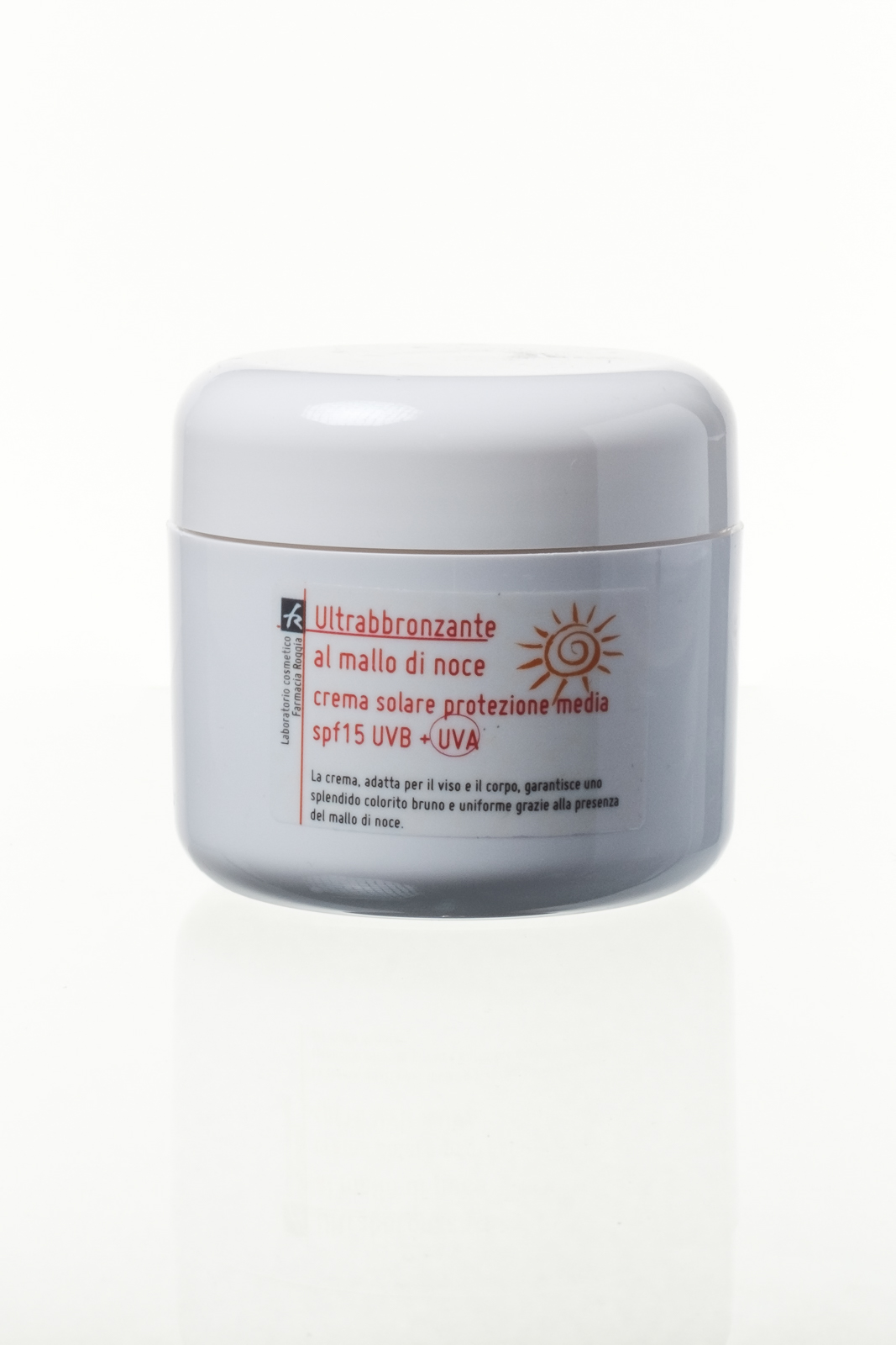 La CREMA SOLARE ULTRABBROZZANTE al mallo di noce SPF 15 e protezione da raggi UVB e UVA, prodotta nel nostro laboratorio cosmetico, è adatta sia alla stagione estiva, in spiaggia, che alla stagione invernale, sulla neve, per chi desidera abbronzarsi, ma con la giusta protezione.